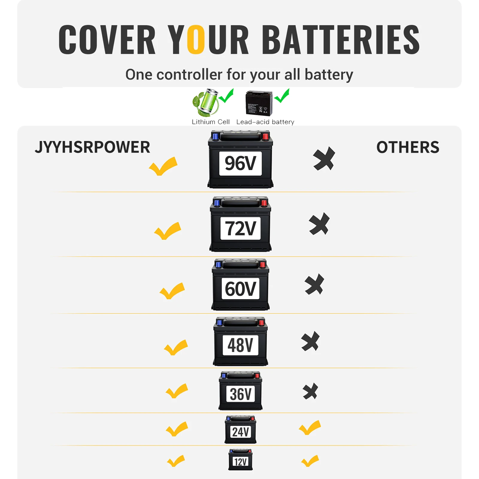 Controlador de carga solar 100% MPPT 120A Inteligente, eficiência máxima ?98,1%, utilização fotovoltaica ?99%.Controlador DSP com alto desempenho Detecção automática de tensão da bateria 12V/24V/36V/48V/60V/72V/84V/96V. Ao ativar a máquina pela primeira vez, certifique-se de que a bateria tem tensão suficiente para evitar que o controlador não seja capaz de ligar devido à baixa tensão.